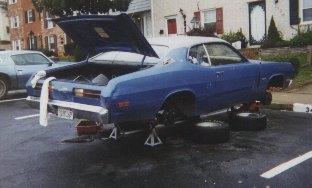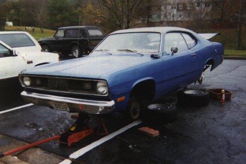 The story of the Duster starts about 8 years ago when my best friend sold it to me at a very good price. I needed a car and he was there for me "Thanks Vinny". The deal was that I would restore it and I have been trying to do just that. In the spring of 96 I towed the Duster to Virginia, It was my primary transportation til 97 when I bought a truck. Since then I have redone the brakes and some of the steering. In 98 I bought a 74 Duster from a kid that thought he knew what he had. I pulled a Mopar 360 out of it and stripped all the other parts I needed. Today it is sitting in my driveway waiting for me to make room in my garage. I need a transmission for it "Hint Hint Vinny" Looking for a A-873 4 speed manual tranny. Here are some of the progress pictures I took